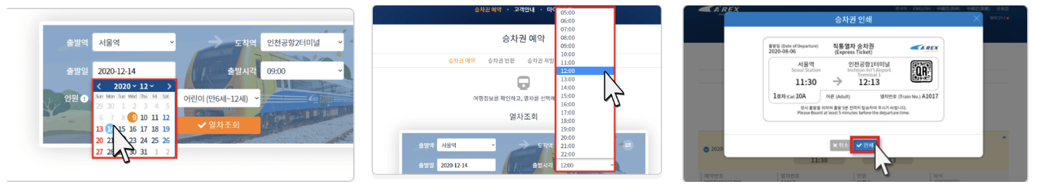 온라인 예매장법 출발역은 서울역, 인천공항1터미널, 인천공항2터미널 중 선택할 수 있습니다. 츨발일은 현재 날짜 기준 최대 2개월까지 조회 가능합니다