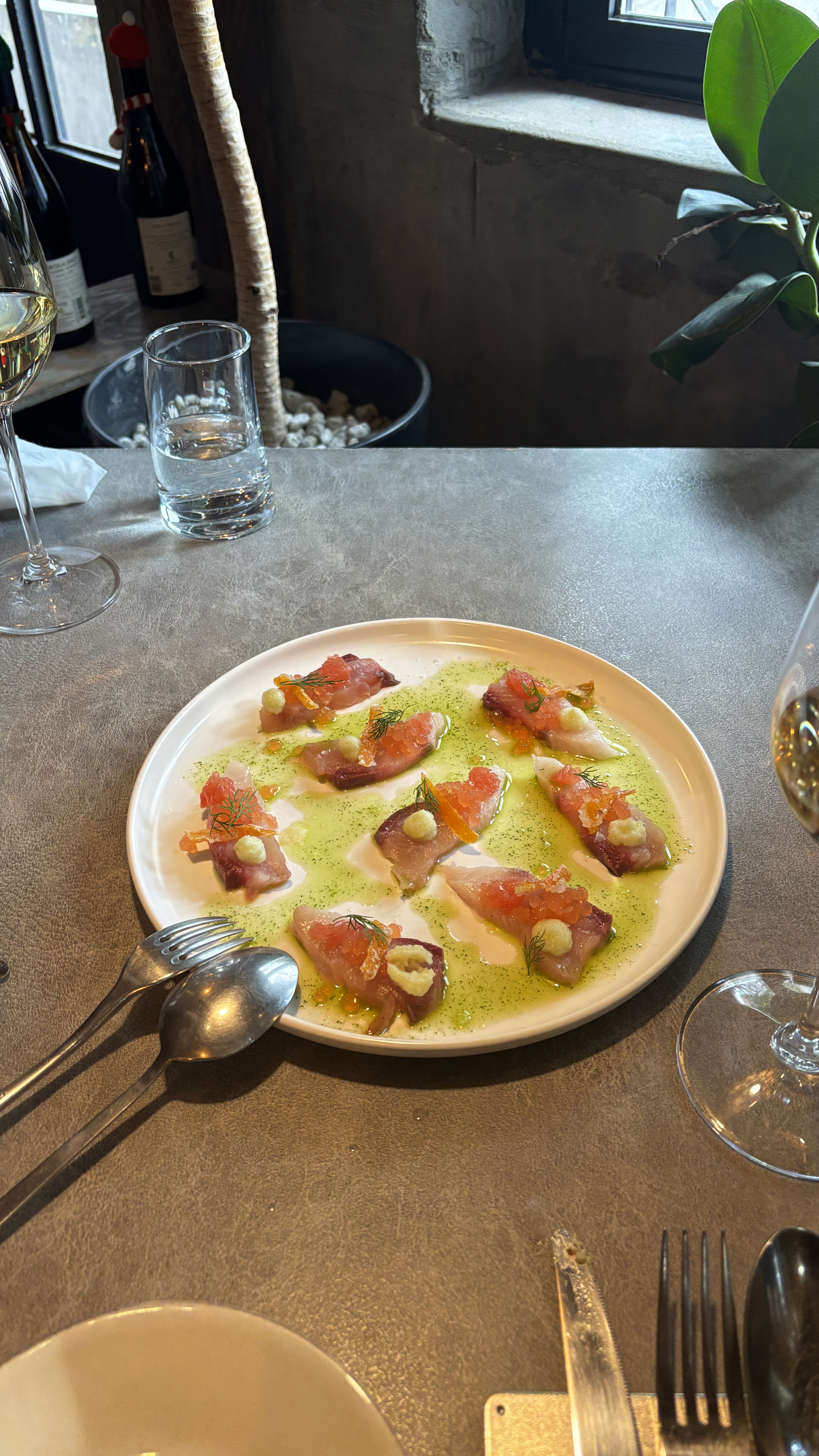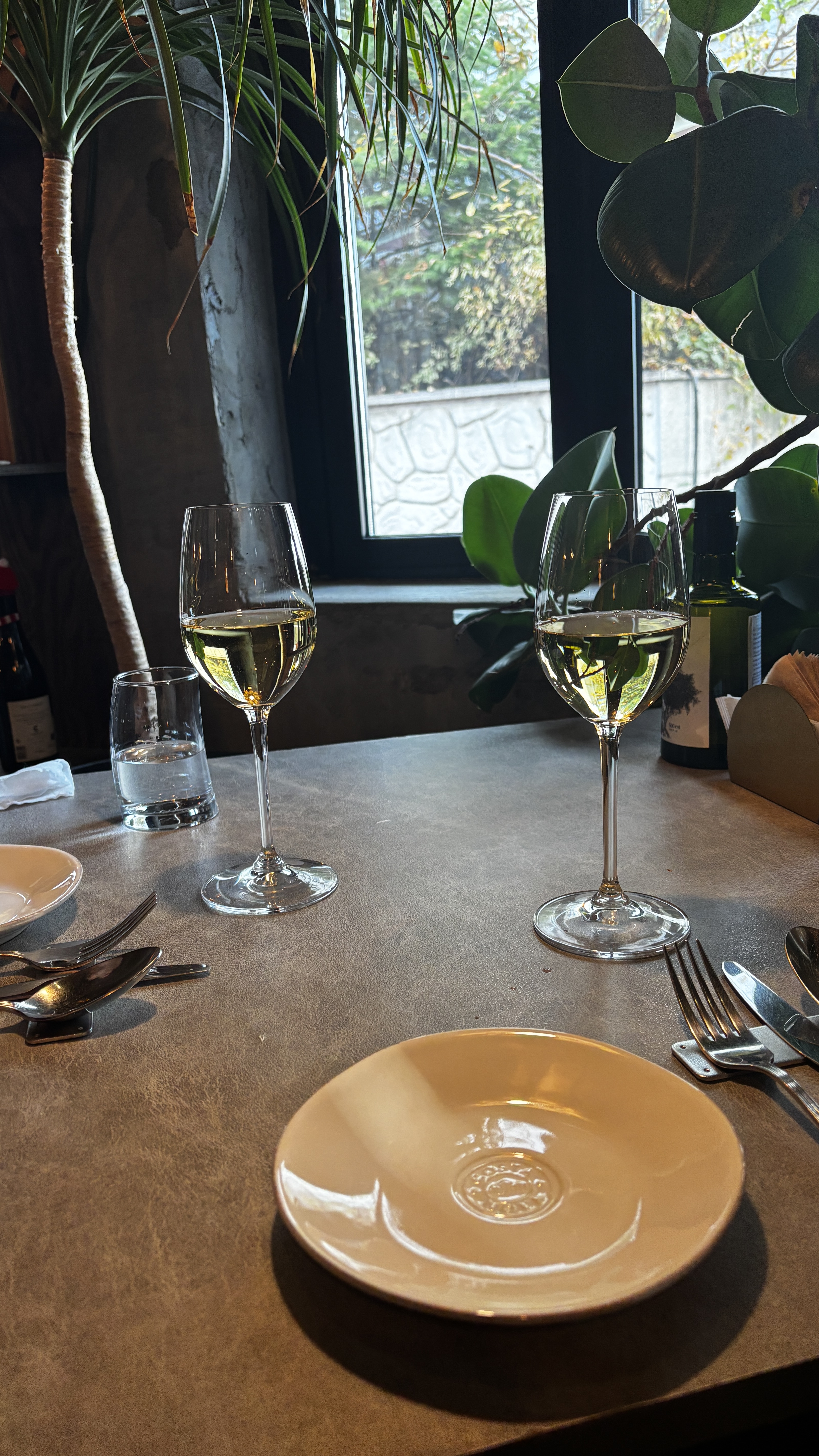 식당에 들어서는 순간부터 마치 유럽의 한적한 와이너리에 온 듯한 느낌을 받았습니다. 따뜻한 조명과 벽돌, 원목 인테리어가 어우러져 고급스러우면서도 편안한 분위기를 연출하고 있었다. 무엇보다 테이블 간격이 넓어 프라이빗한 느낌이 강했고, 창가 쪽 좌석에서는 이태원의 야경도 은은하게 보였습니다. 기념일을 보내기에 더할 나위 없이 좋은 분위기였다.